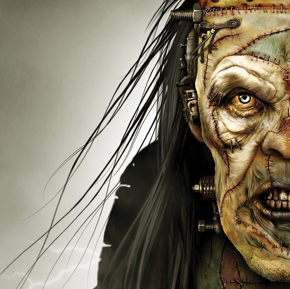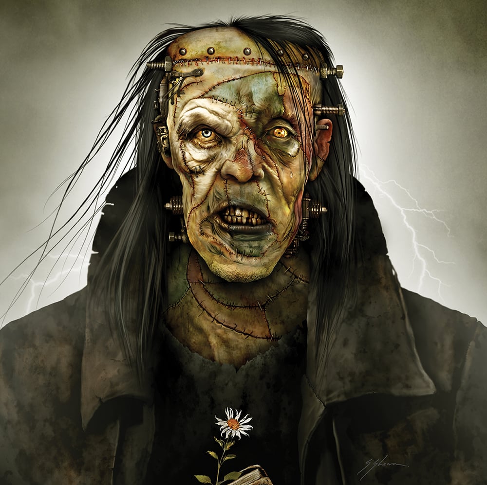 As I result, I hoped this might influence and inspire others to view the creature as both violator and victim, both fearsome and fearful... containing perhaps two sides to the man made from many. One half of his face reflects rage, the other rejection.